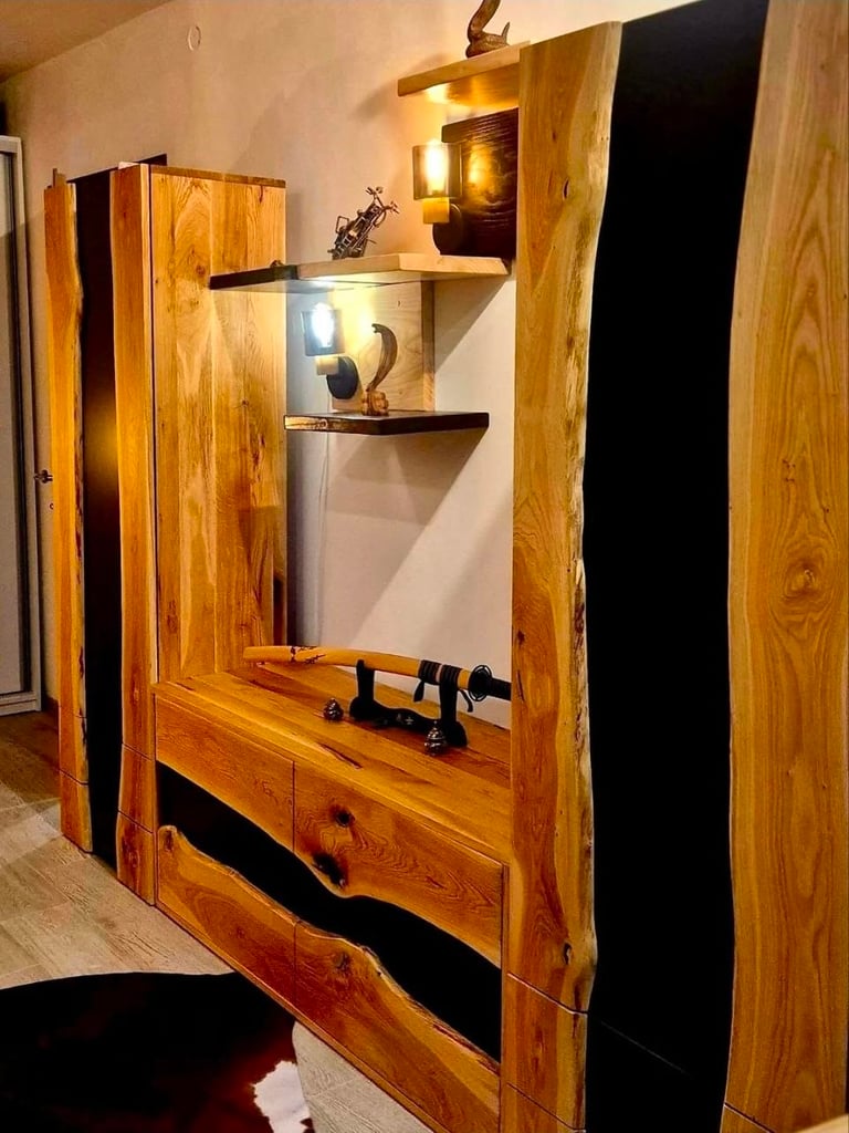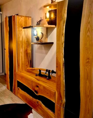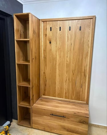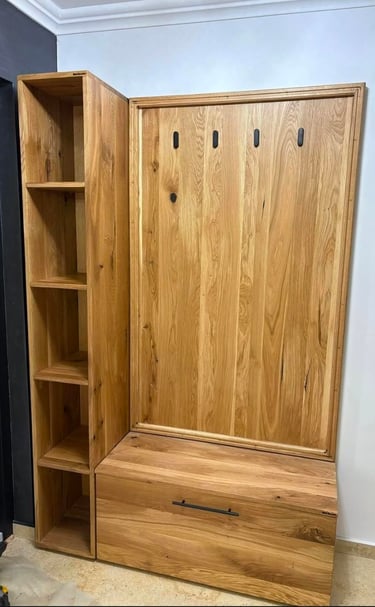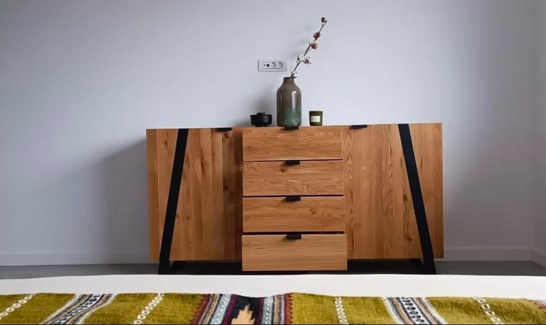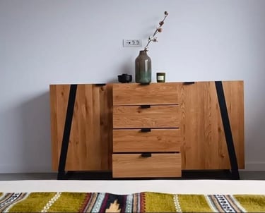 A modern storage cabinet crafted from premium solid wood, combining clean design with practical functionality. Featuring spacious drawers and side compartments, it offers durable, elegant storage while showcasing the natural beauty of the wood grain.